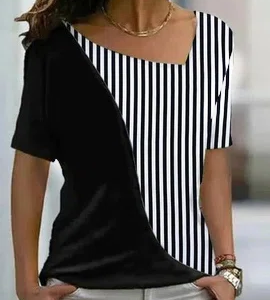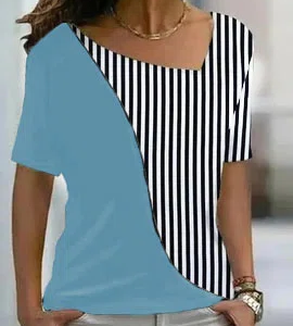 Be the first to review “Asymmetrical Neck Striped Color Block Basic Casual Cotton-Blend T-Shirt/Tee”