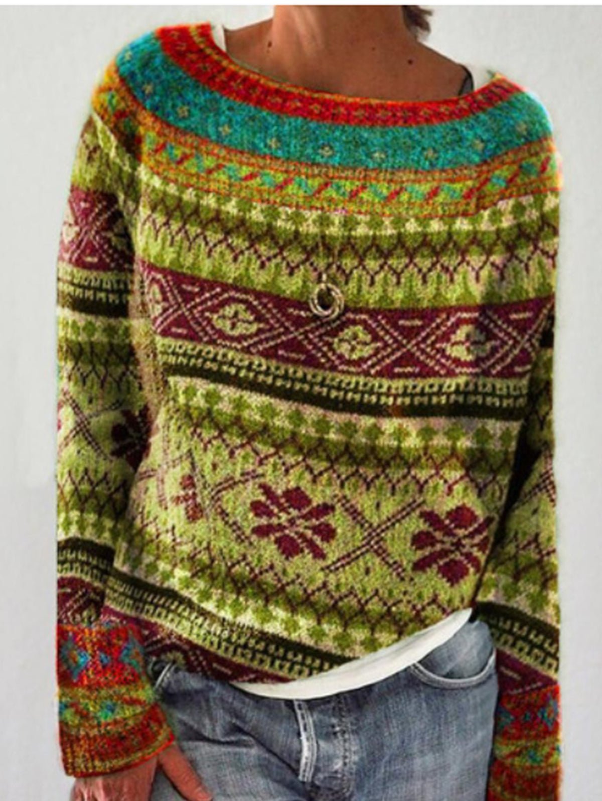 Boat Neck Retro Geo & Colorblock Knit Sweater