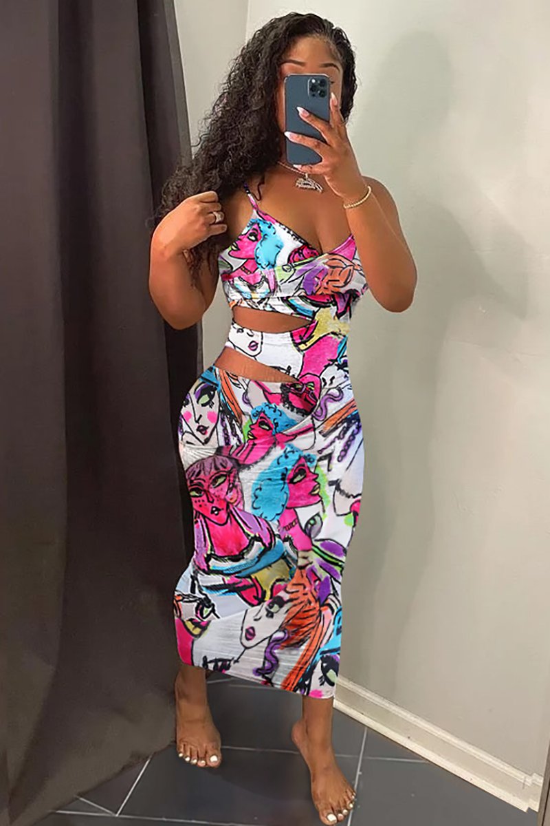 Cami Deep V Neck Cutout Bodycon Portrait Print Midi Dresses [Pre Order]