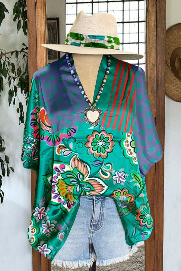 Elegant Floral Print Paneled Striped Star Print Top