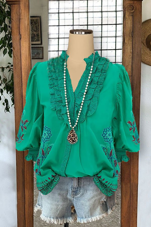 Floral Print Pleated Ruffle V-neck Blouses