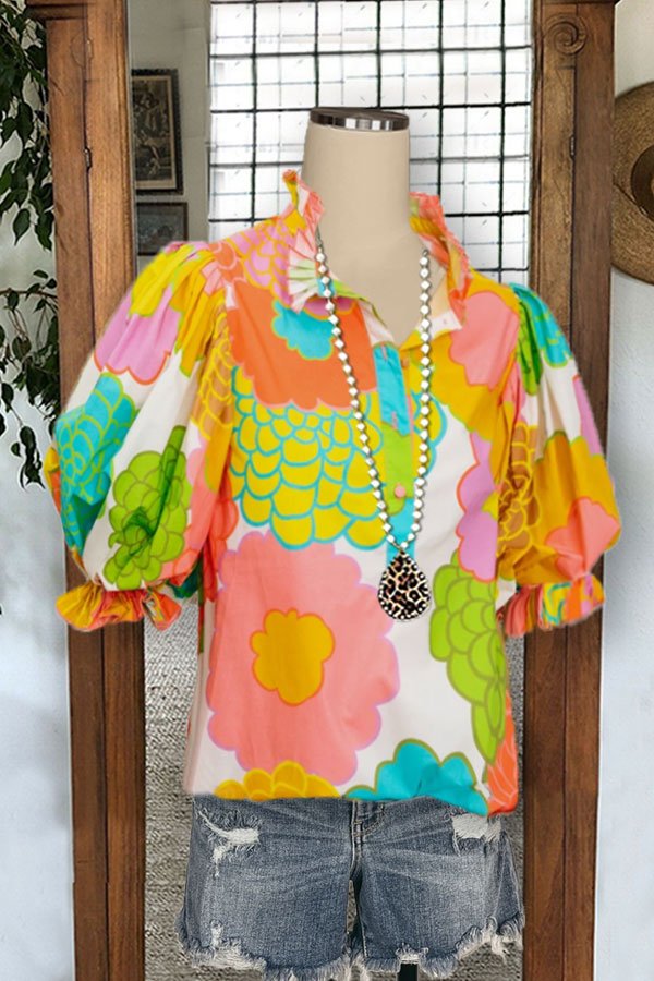 Be the first to review “Floral Print Puff Sleeved Pleated Ruffled Collar Top”