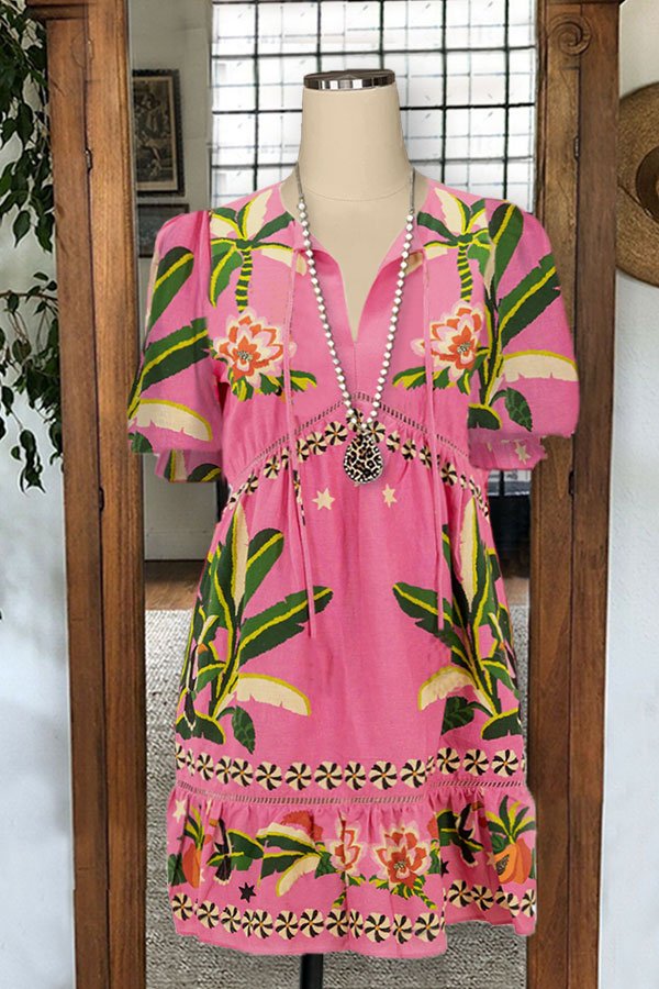 Lace Paneled Pleated Floral Print Puff Sleeved Dress