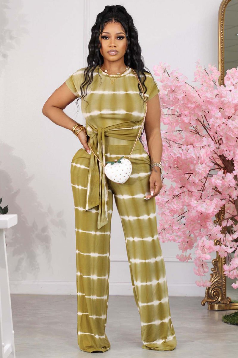 Pattern Print Short Sleeve Tie Up Sash Crop Top Straight Leg Two-Piece Set