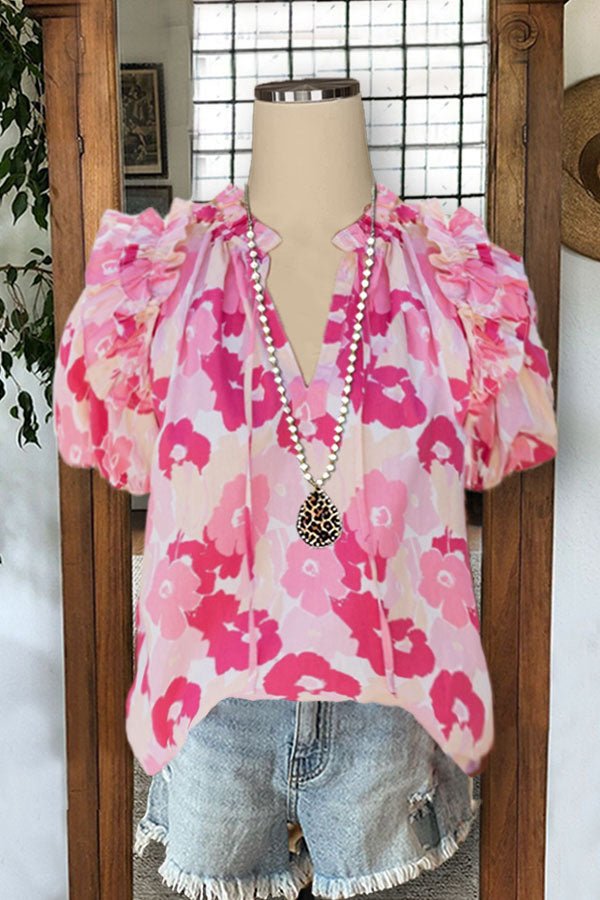 Pleated Ruffle Puff Sleeve Floral Print V-neck Top