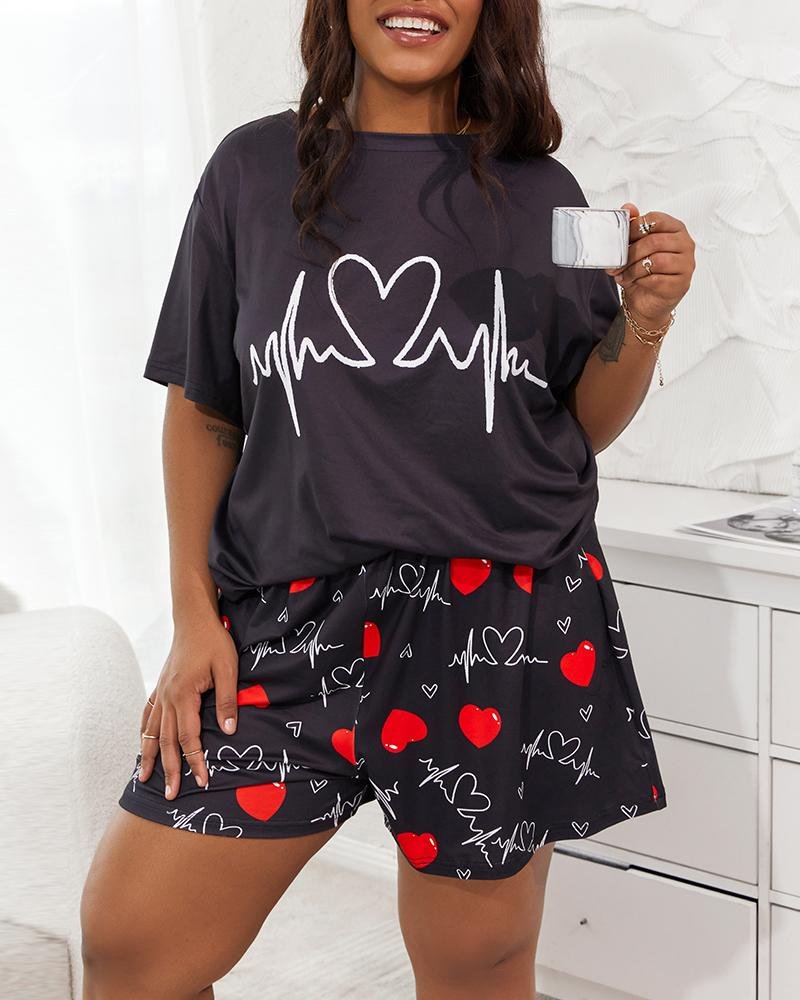 Plus Size Heart Print Short Sleeve Pajamas Set