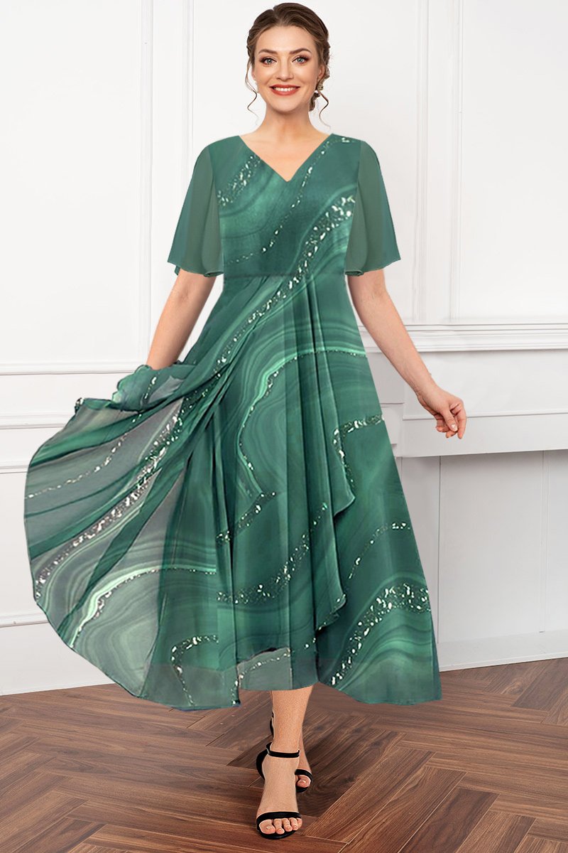 Be the first to review “Plus Size Mother Of The Bride Green Texture Print Ruffle Sleeve Tunic Tea-Length Dress”
