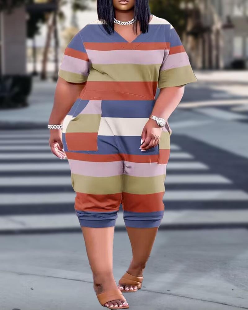 Plus Size Striped Colorblock Pocket Design Short Sleeve Jumpsuit