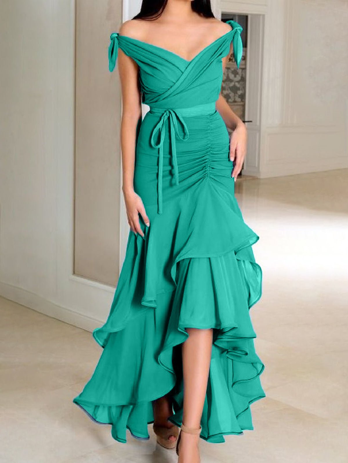 Be the first to review “Sexy Plain Off Shoulder Tulip Hem Layered Ruffle Ruched Dress”