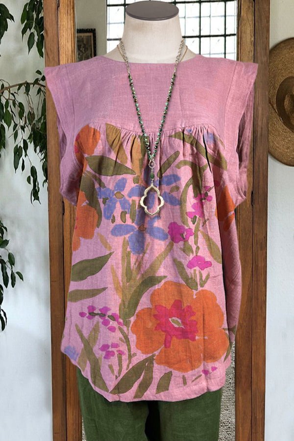 Vintage Cotton Linen Stitching Flower Printed Top