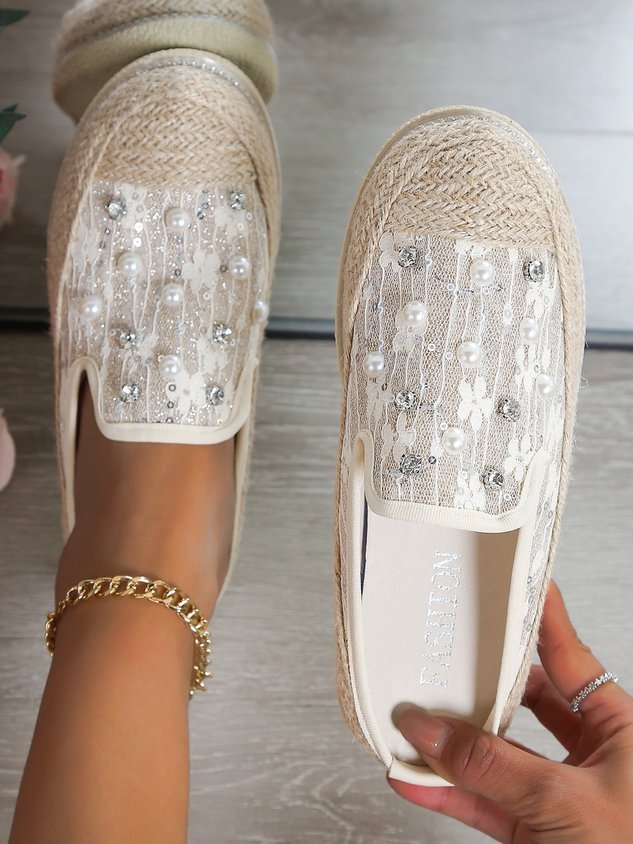 Women Faux Pearls Floral Lace Espadrille Mules