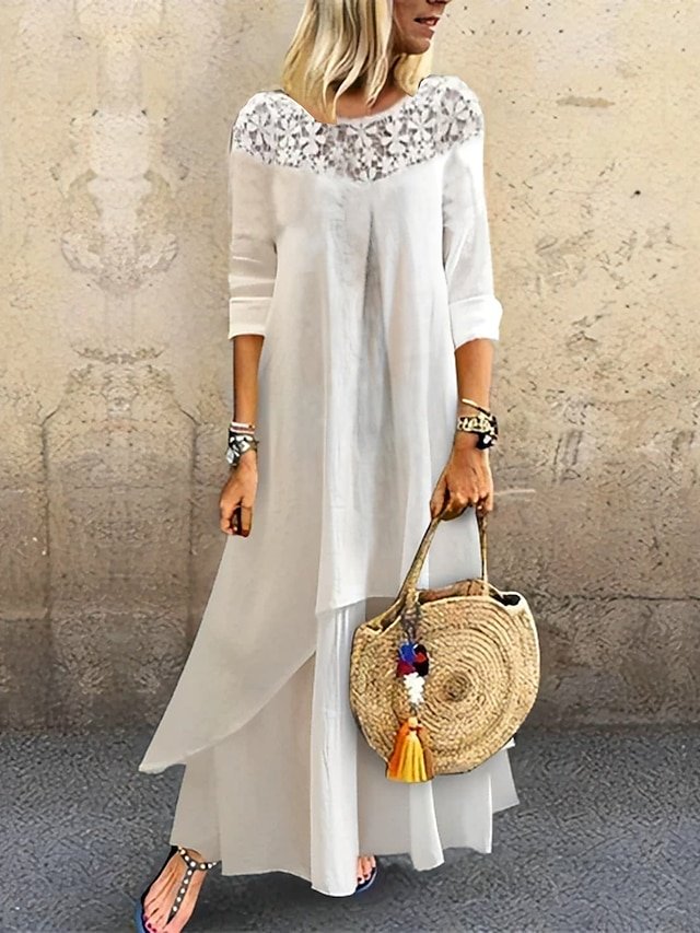 Women’s Casual Dress Cotton Linen Dress Tiered Dress Maxi long Dress Cotton Blend Fashion Modern Outdoor Daily Vacation Crew Neck Lace Patchwork Half Sleeve Summer Spring Fall 2024 Loose Fit White#9553334