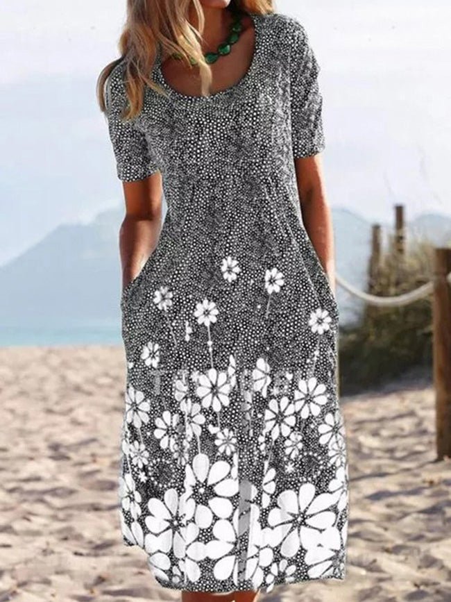 Women’s Dresses Round Neck Vintage Floral Pocket Short Sleeve Dress
