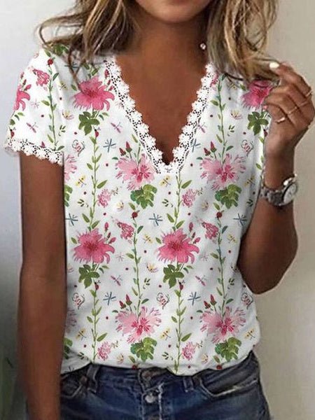 Women’s Floral Printed Hollow Short Sleeve V-neck Top