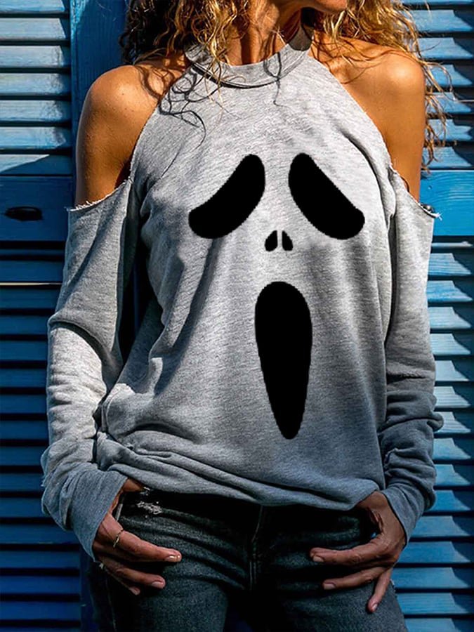 Women’s Ghost Face Print Off-Shoulder Halterneck Long-Sleeve T-Shirt