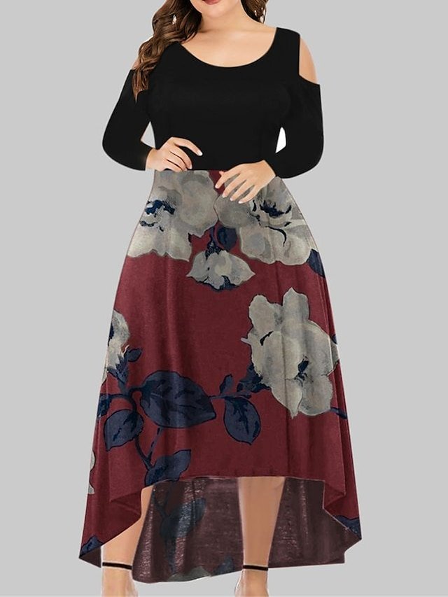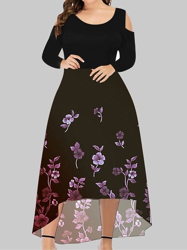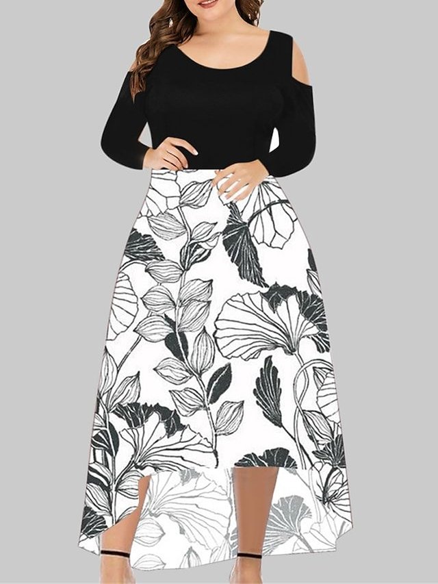Women’s Plus Size Casual Dress A Line Dress Floral Long Dress Maxi Dress Long Sleeve Plus High Low Print Crew Neck Fashion Office Black White Summer Spring XL XXL 3XL 4XL 5XL