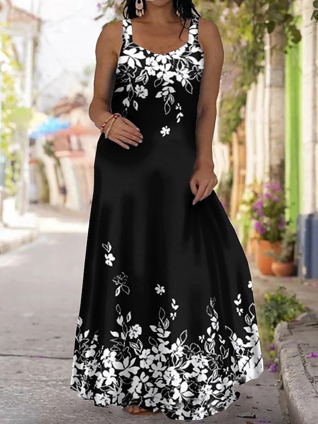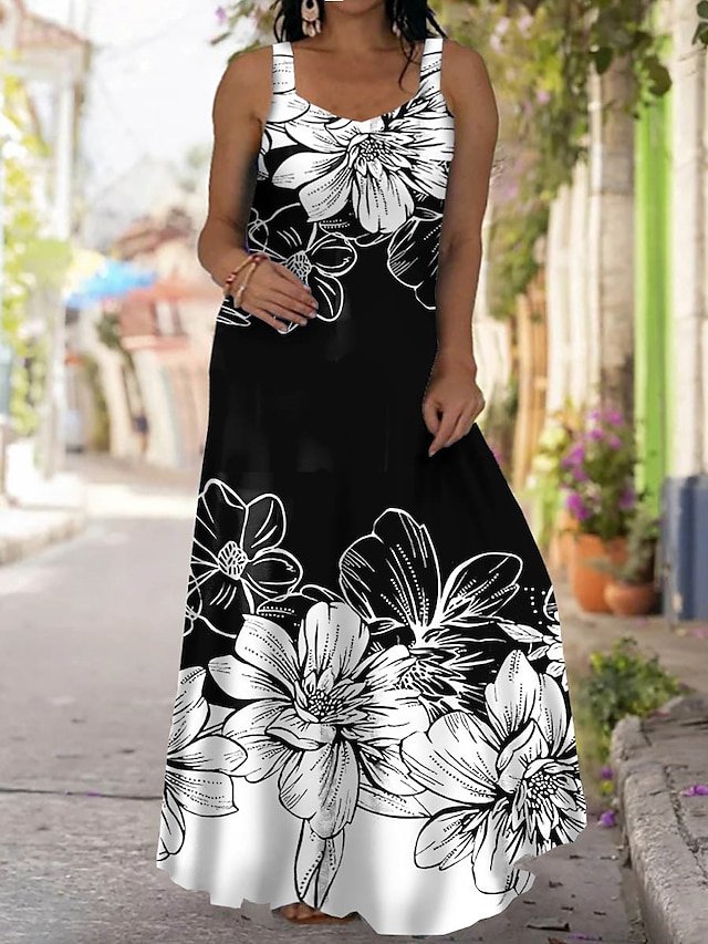 Women’s Plus Size Casual Dress Strap Dress Floral Long Dress Maxi Dress Sleeveless Print Strap Fashion Outdoor Black White Summer Spring L XL XXL 3XL 4XL