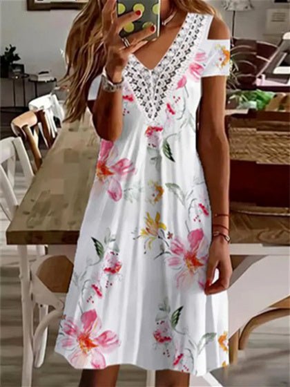 Women’s Short-sleeved Off-the-shoulder V-neck Lace Floral Print Casual Dress