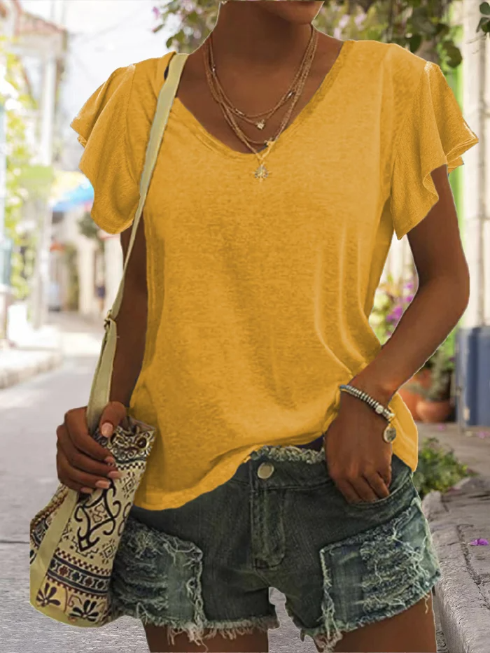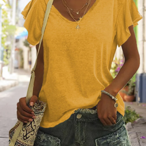Women’s Solid V-Neck Ruffle Sleeve T-Shirt